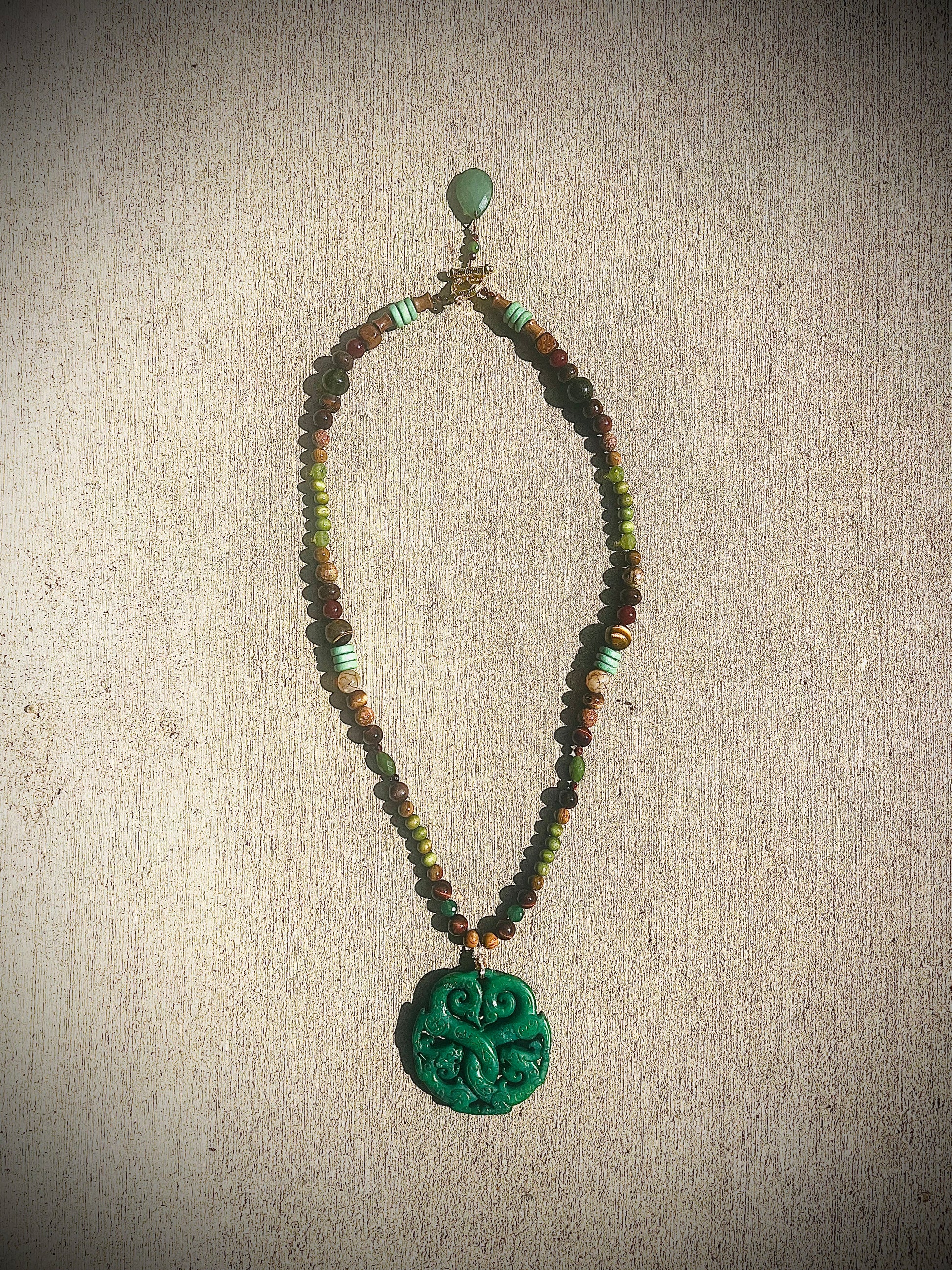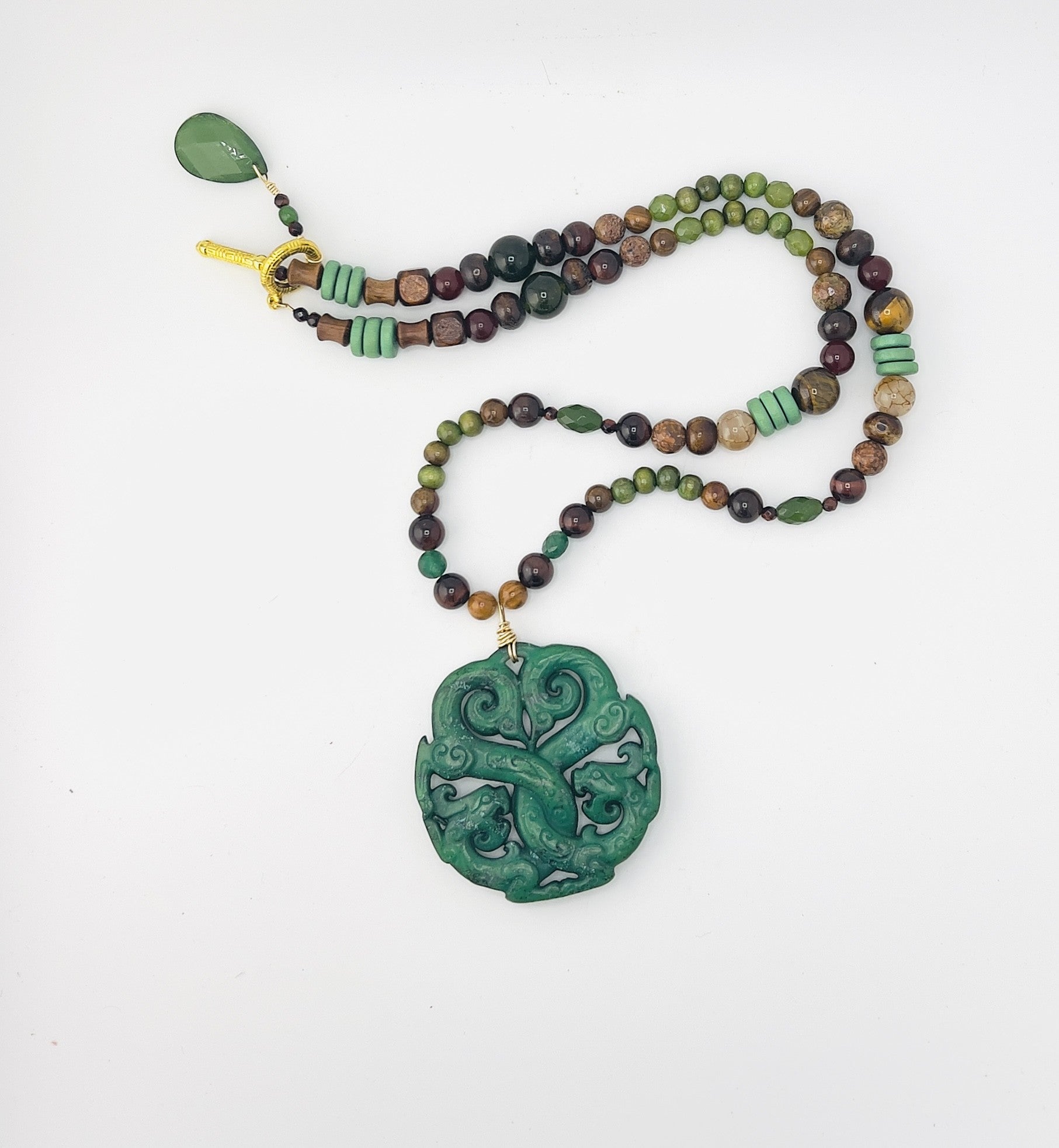 The Jade Guardian Necklace is a powerful one-of-a-kind statement piece centered around a carved green jade medallion, long revered as a stone of protection and harmony. The bold pendant is paired with an earthy mix of gemstones in rich shades of forest green, warm brown, golden amber, and soft turquoise, creating a natural balance of color and energy.