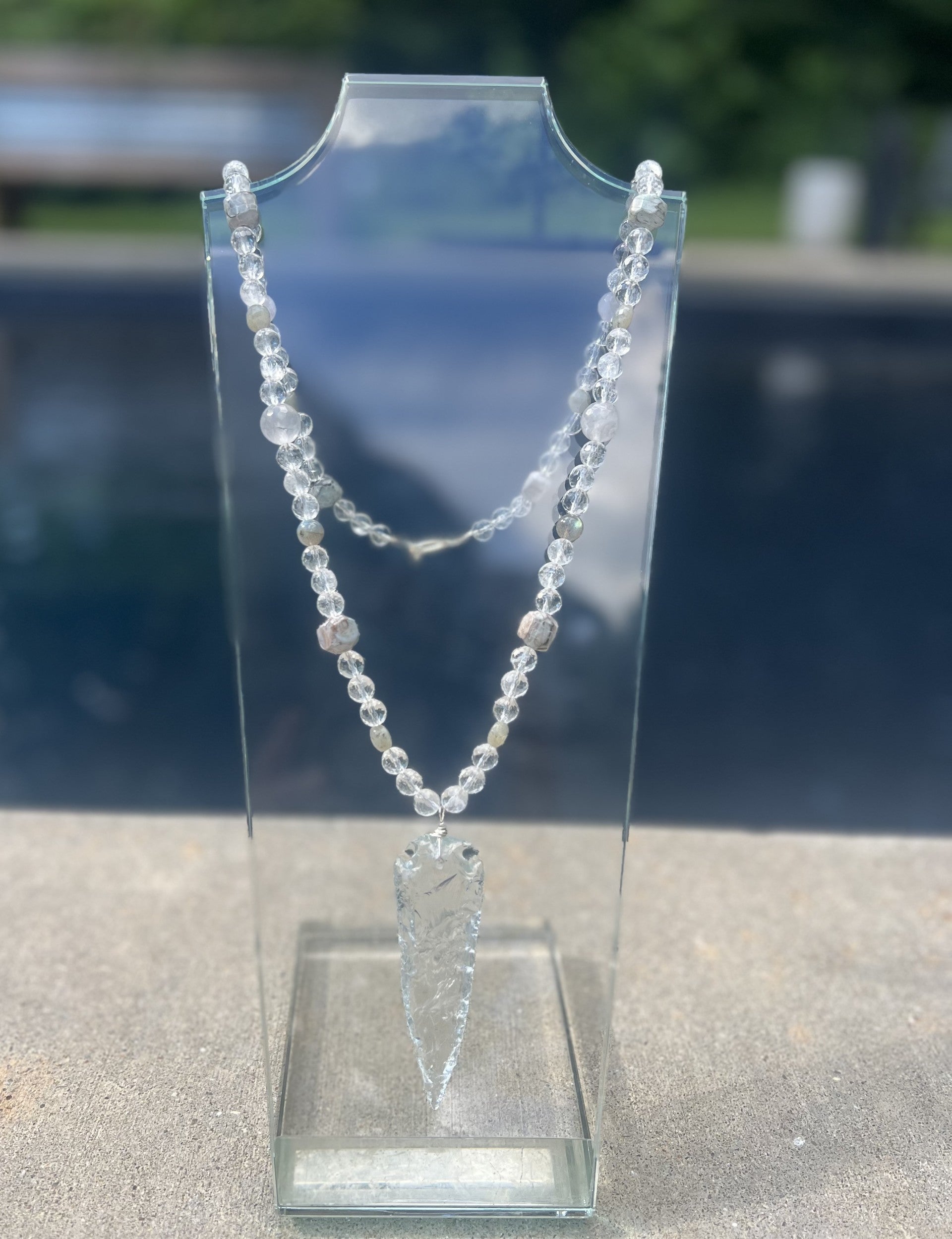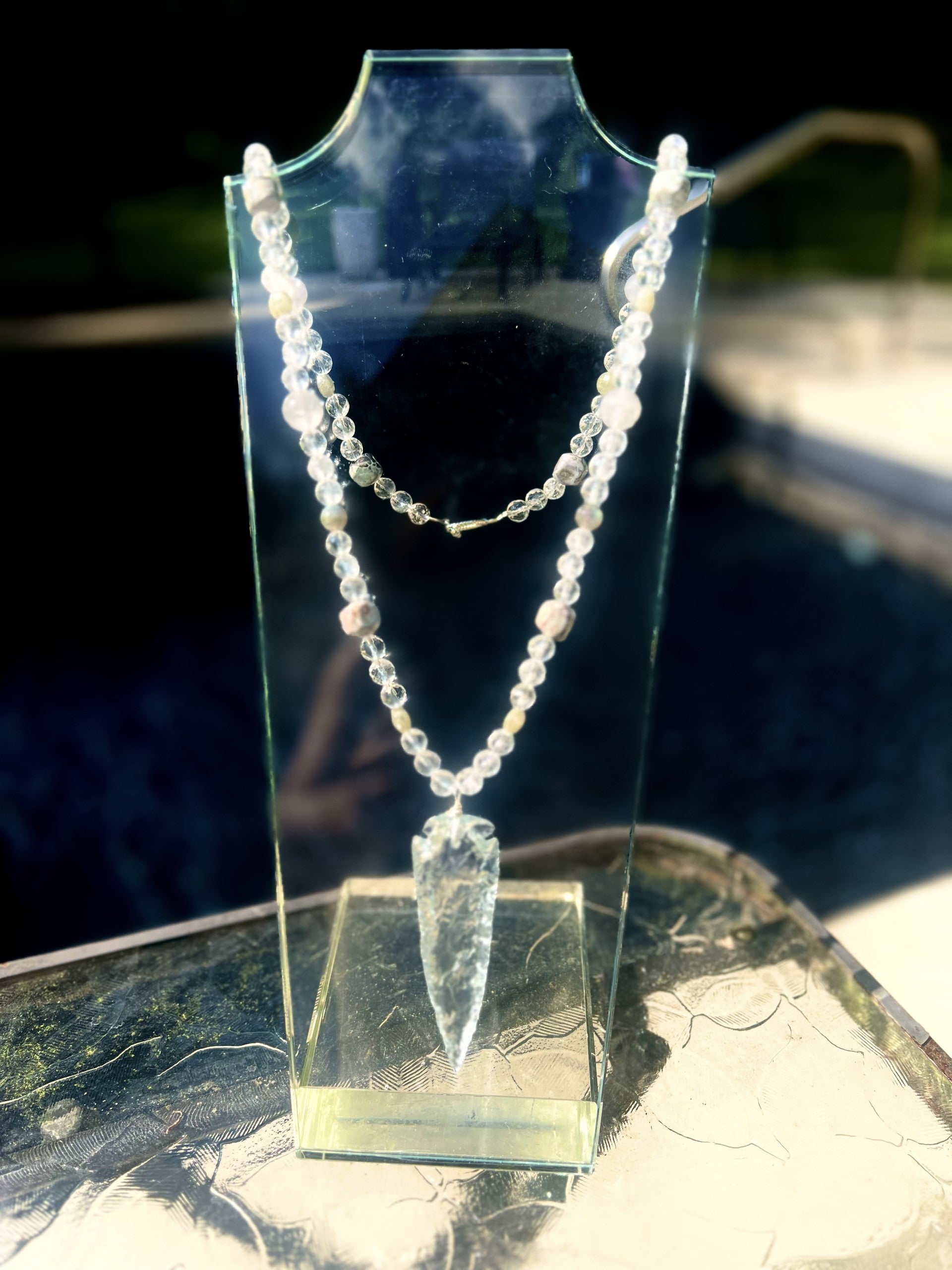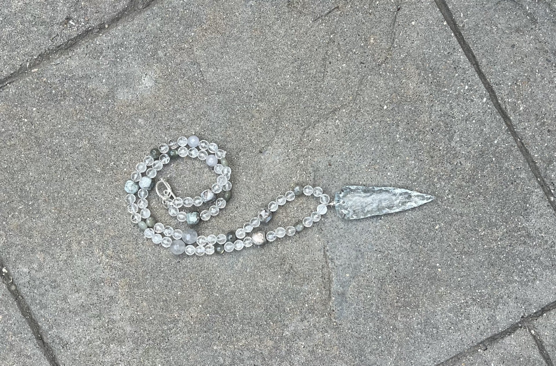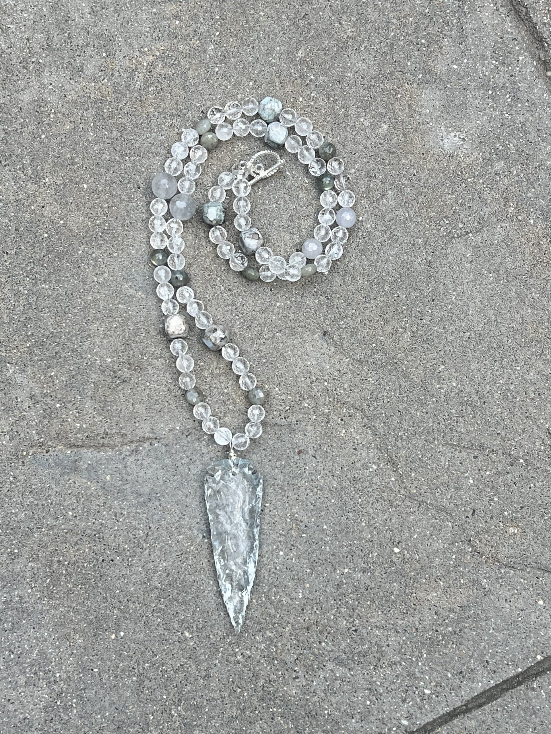 Materials: Clear quartz 3.5 inch arrowhead, mostly faceted clear quartz beads and other stone accents. Silver plated wire and toggle.