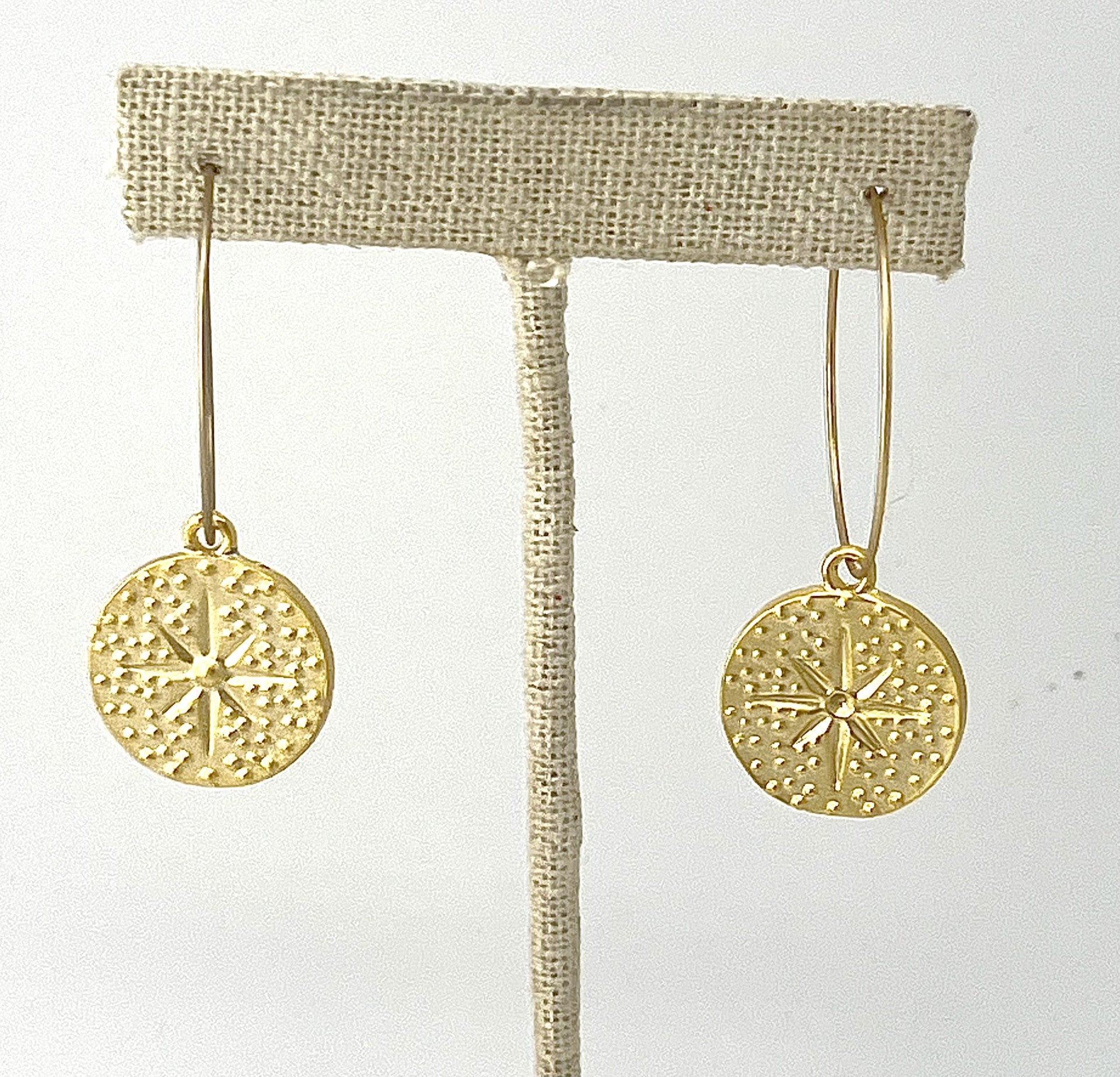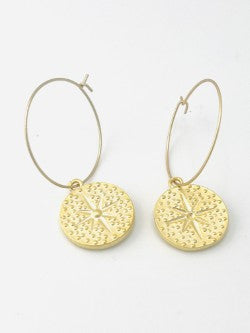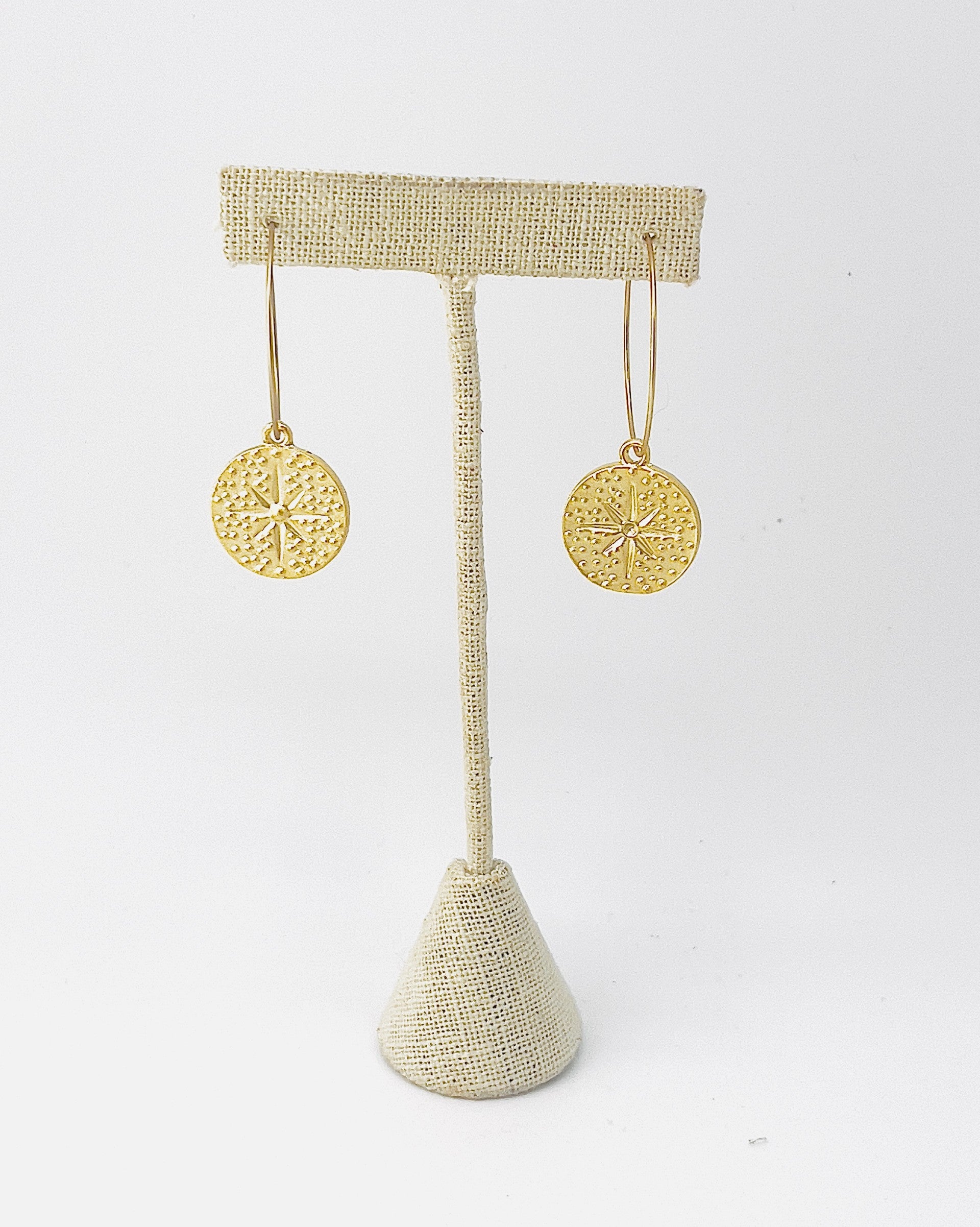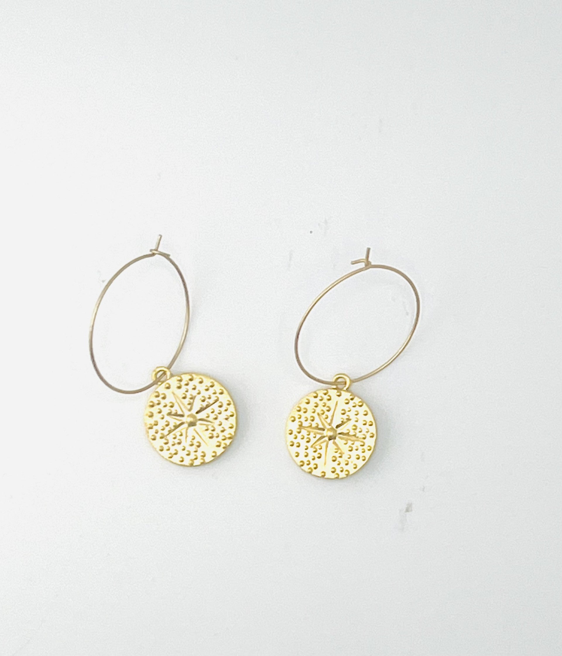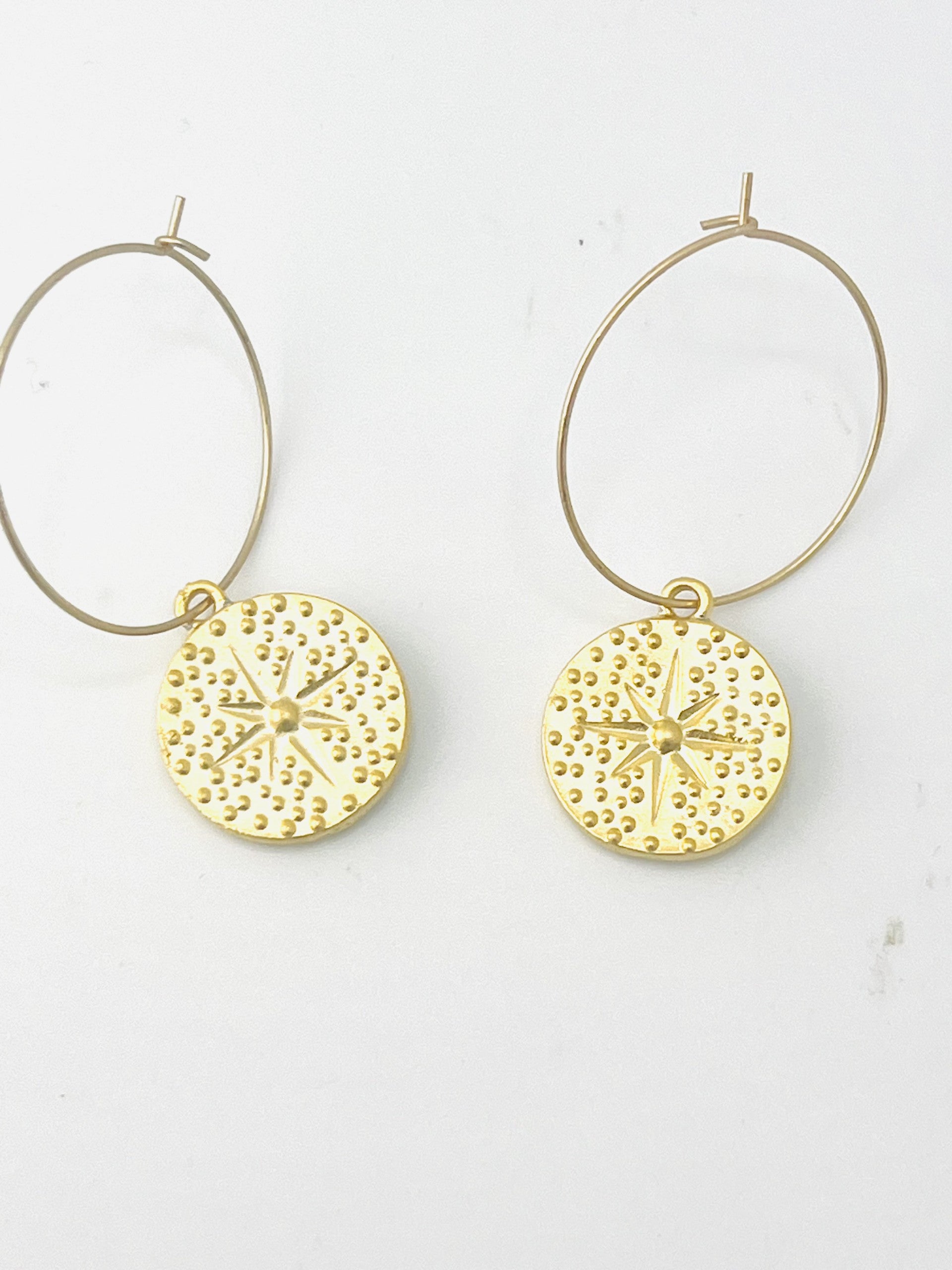 Embrace celestial charm with the Kimberly Hoops. These elegant earrings feature delicate matte gold-toned hoops suspending intricately detailed sunburst charms. The textured surface of the circular pendants radiates a subtle shimmer, catching the light with every movement. Lightweight and versatile, the Kimberley Hoops add a touch of radiant sophistication to any ensemble, making them perfect for both everyday wear and special occasions.