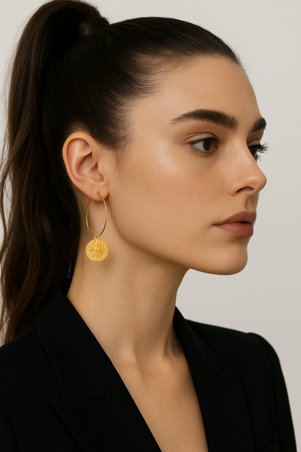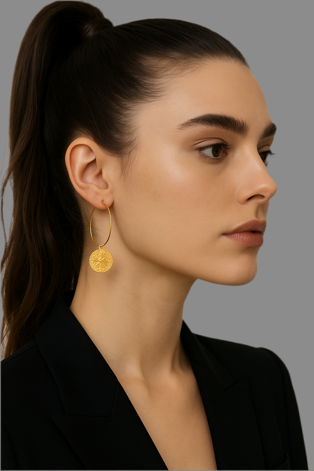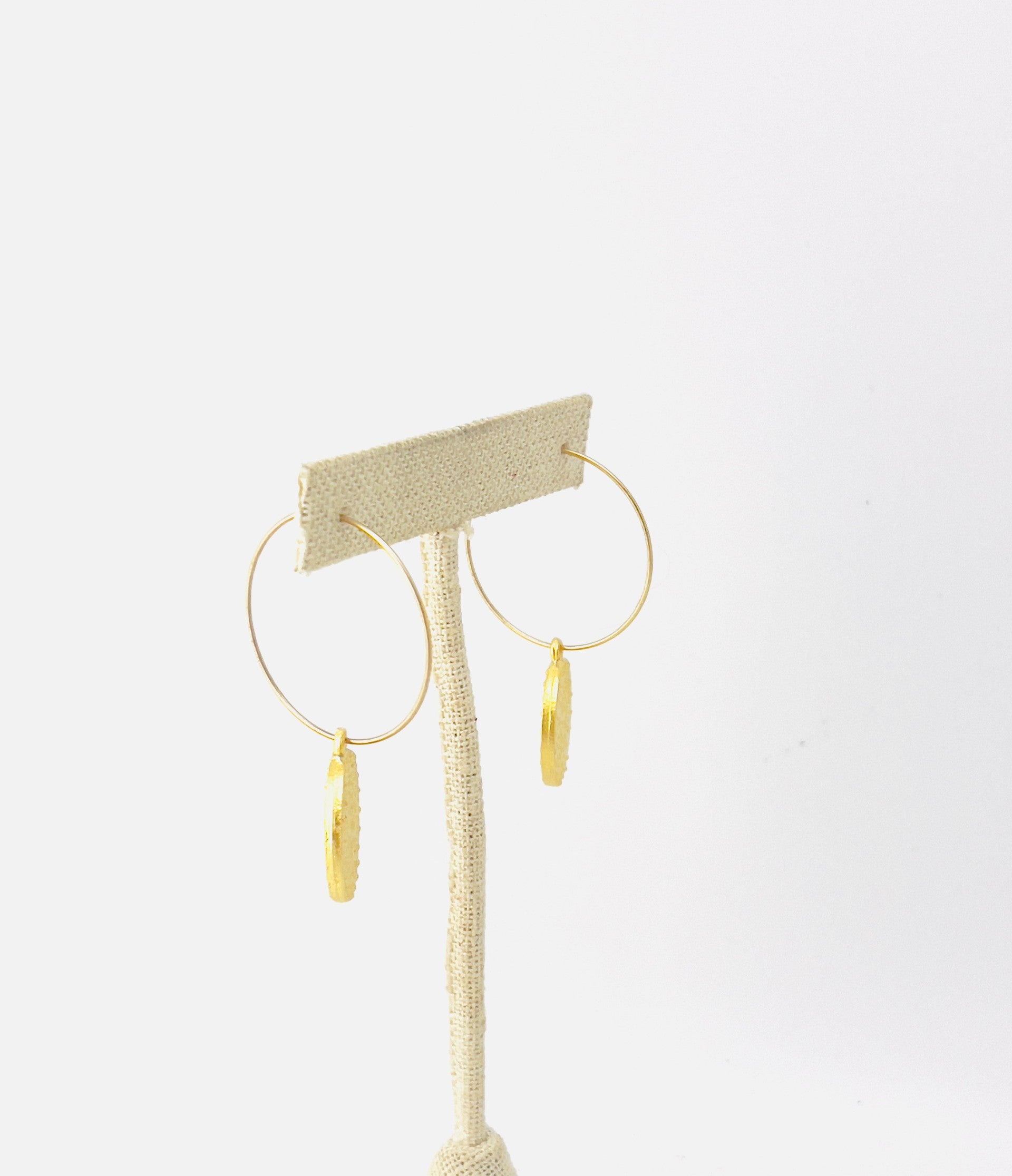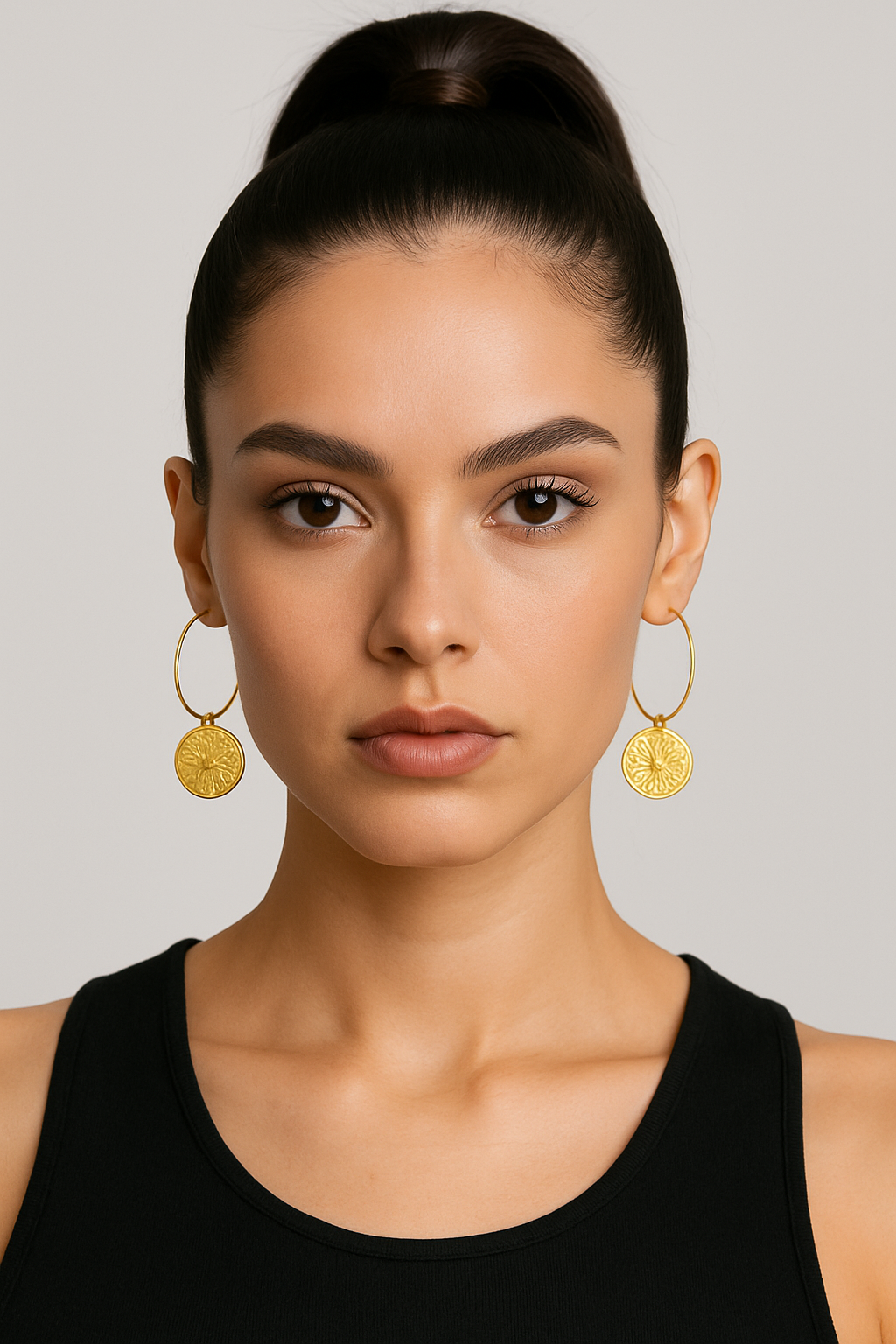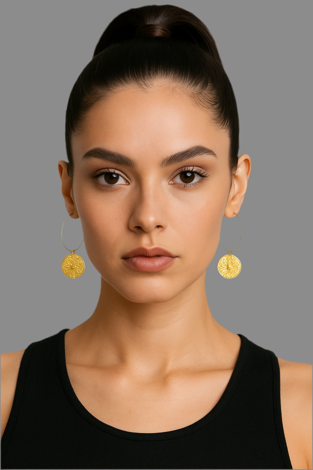 Embrace celestial charm with the Kimberly Hoops. These elegant earrings feature delicate matte gold-toned hoops suspending intricately detailed sunburst charms. The textured surface of the circular pendants radiates a subtle shimmer, catching the light with every movement. Lightweight and versatile, the Kimberley Hoops add a touch of radiant sophistication to any ensemble, making them perfect for both everyday wear and special occasions.