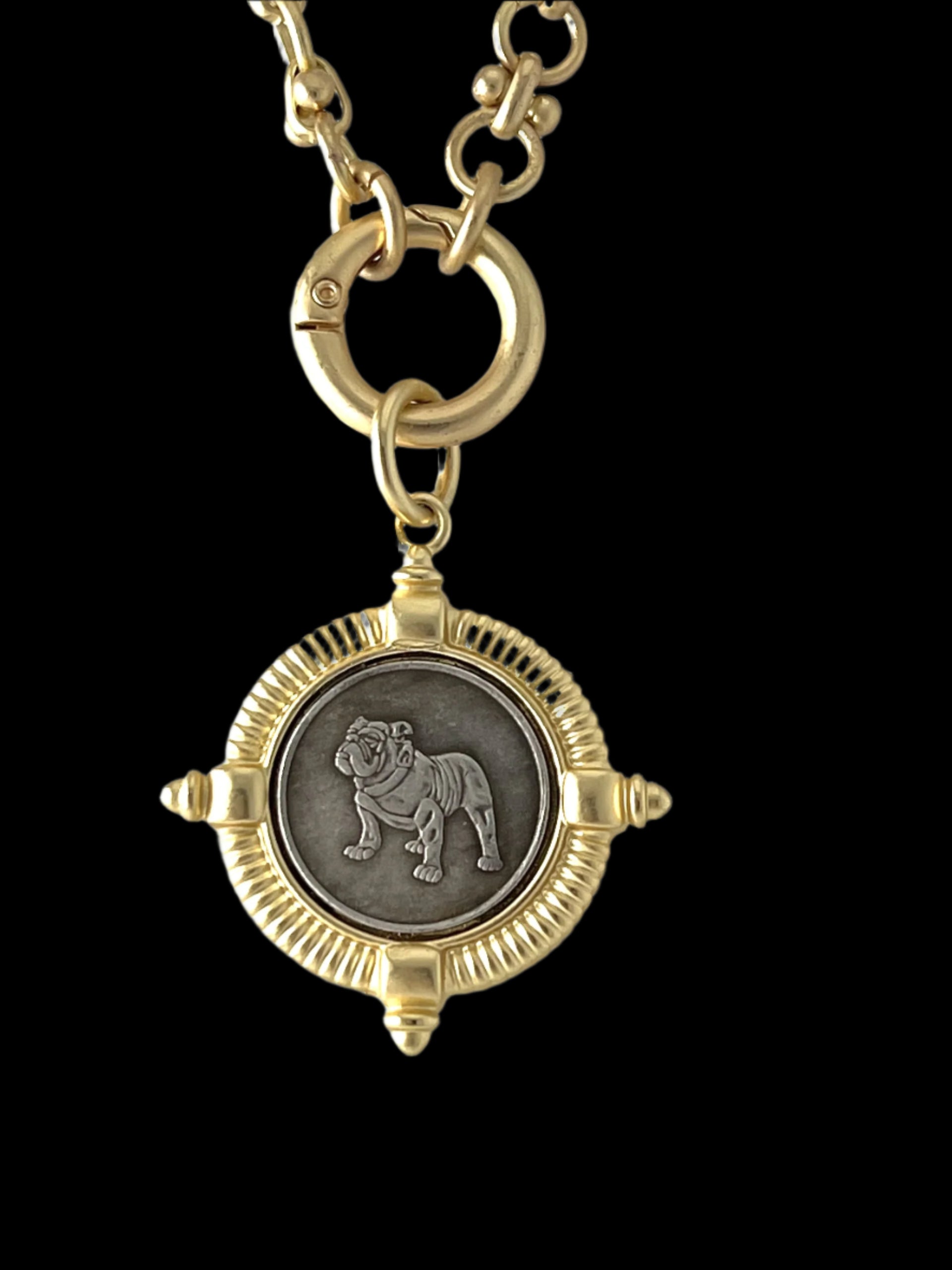 Chunky Matte gold chain, .75 inch matte gold carabiner, 1.5 inch mixed metal bull dog pendant