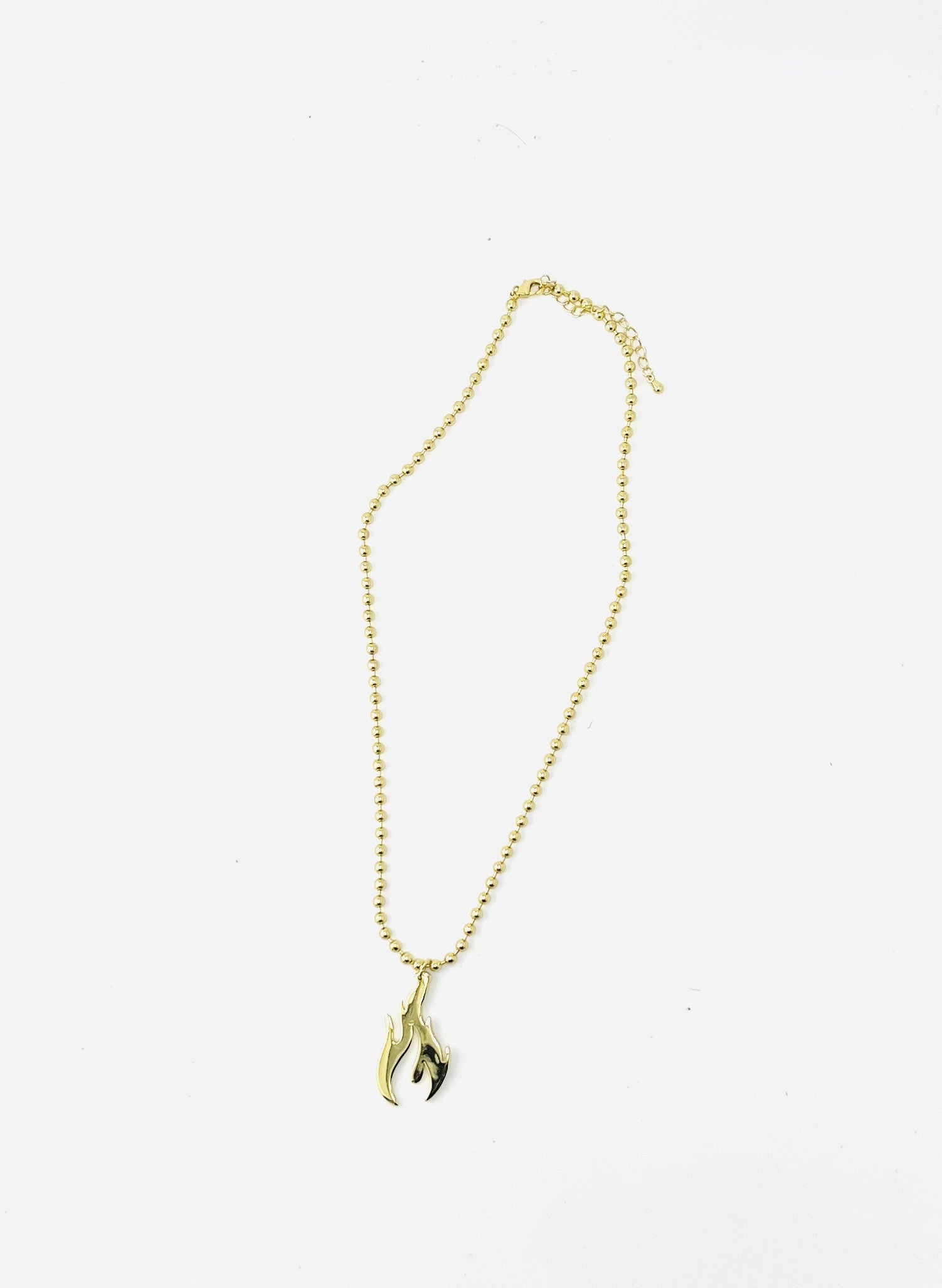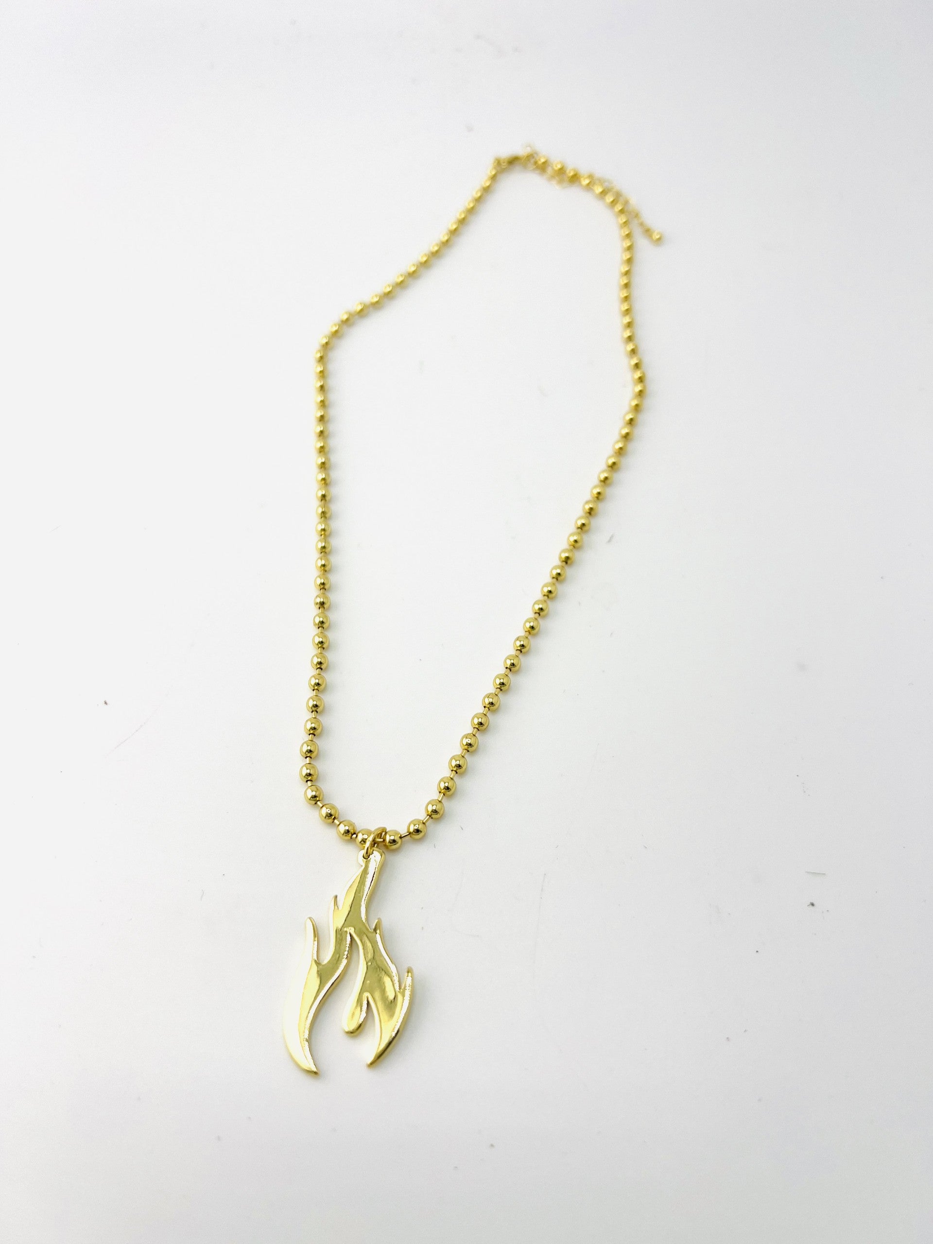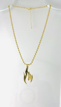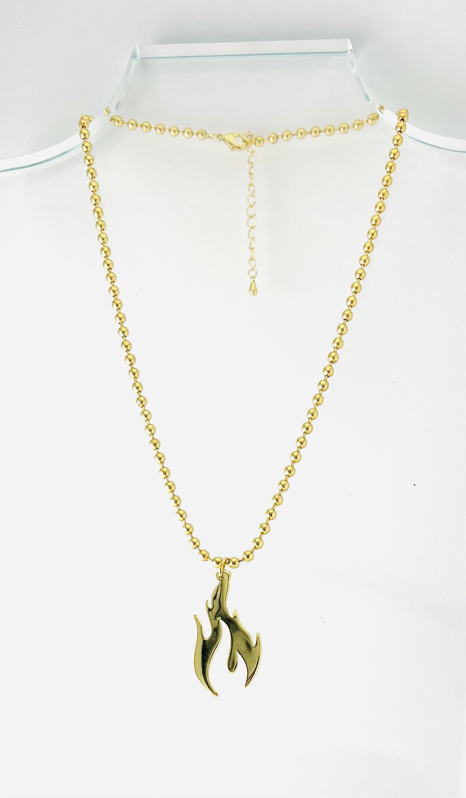 Crafted in glowing gold-filled metal, this necklace features a striking twin flame pendant measuring 1.5” x 0.75”. Hanging gracefully from a beaded gold-filled chain, the flame design symbolizes passion, connection, and inner strength—making it a meaningful piece to wear close to your heart. With its bold yet elegant presence, this necklace is perfect for layering or wearing solo as a statement.