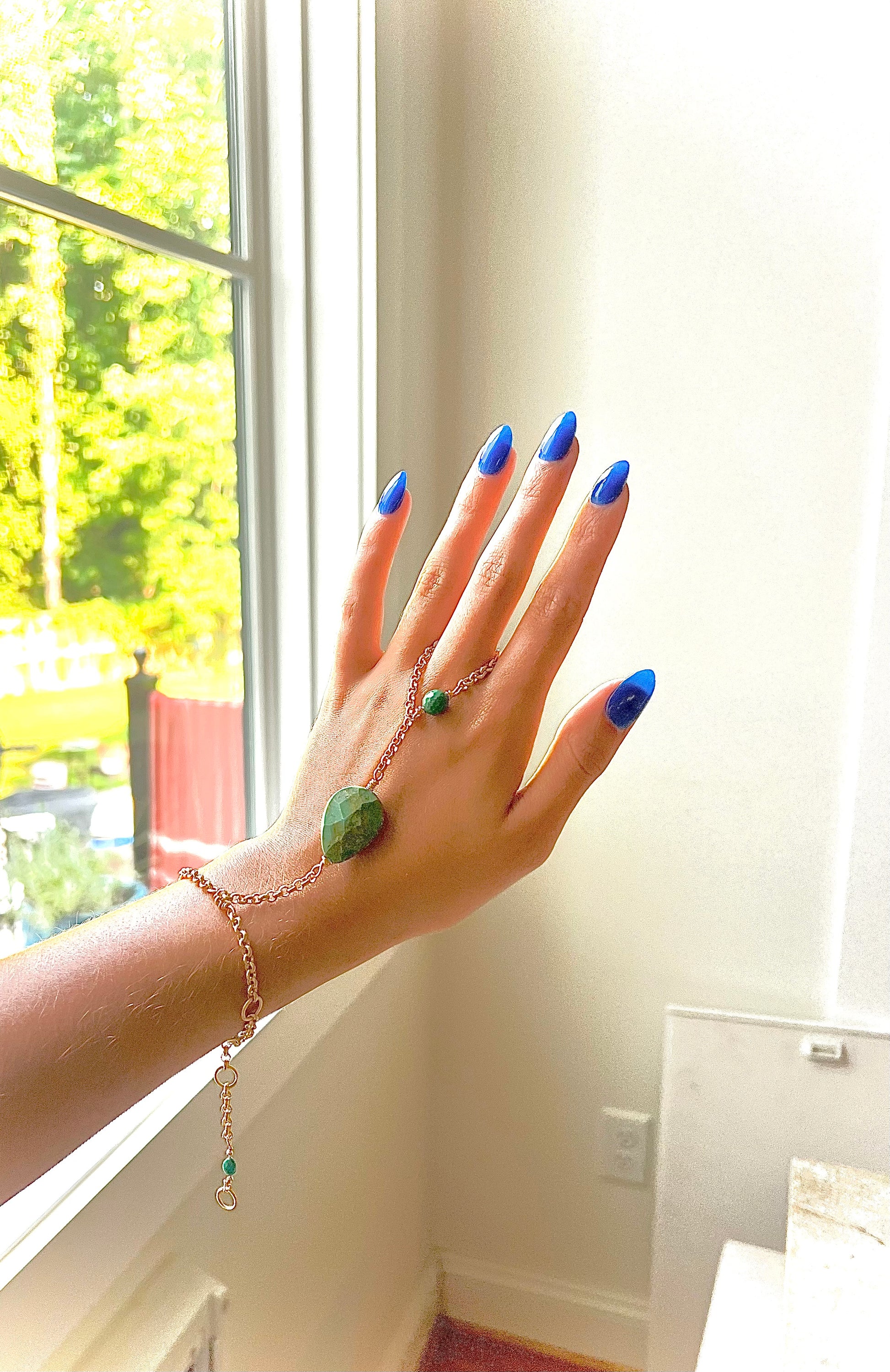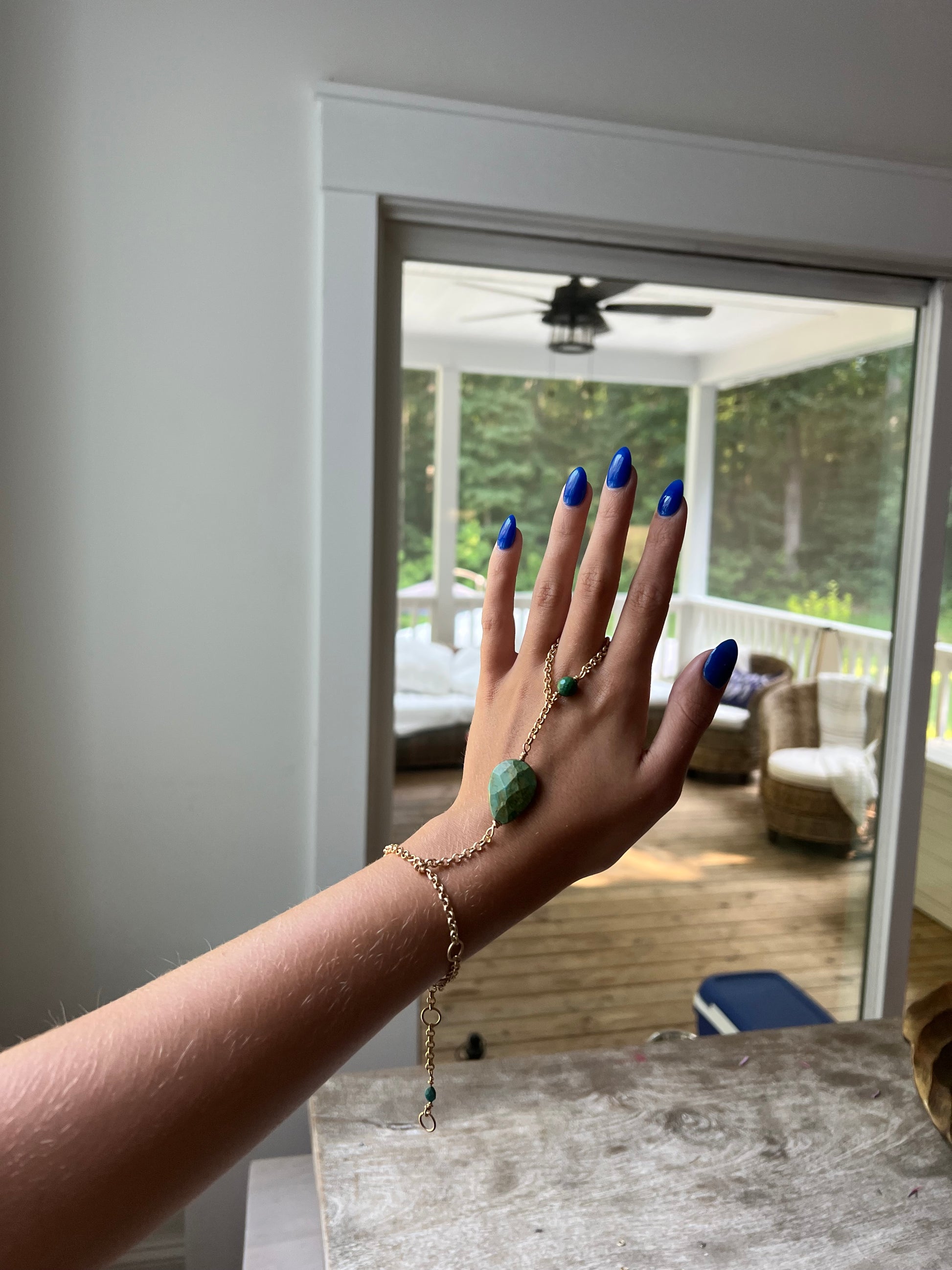Elevate your everyday with the Molly Hand Chain — where desert soul meets golden glam. This striking piece features a faceted turquoise teardrop stone at the center, gracefully connecting a dainty gold-plated chain from finger to wrist. A deep green turquoise bead adds the perfect pop of earthy contrast, making this hand chain a bold yet grounded statement.